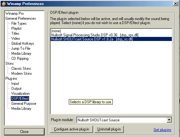 bien pues en esta ventana seleccionamos el menú "DSP/Effect" y ahí por consiguiente seleccionamos "Nullsoft SHOUTcast Source DSP......." como aparece en la imagen. Cuando hayan sido seleccionadas. se abrirá otra ventana, ahora ya podemos cerrar esta con el botón que aparece que dice CLOSE
