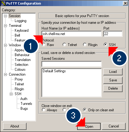 Paso 1 - Teclear en la sección (Host Name or IP address): ssh.shell-mx.net